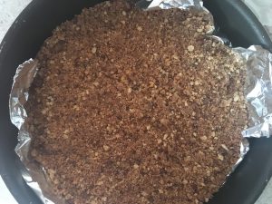 Tritate i frollini finemente (io ho usato il bimby -robot da cucina, in alternativa potete utilizzare un bicchiere e schiacciarli fino a ridurli in briciole fini) e fondete il burro, dopodiché amalgamate i biscotti con il burro fuso.