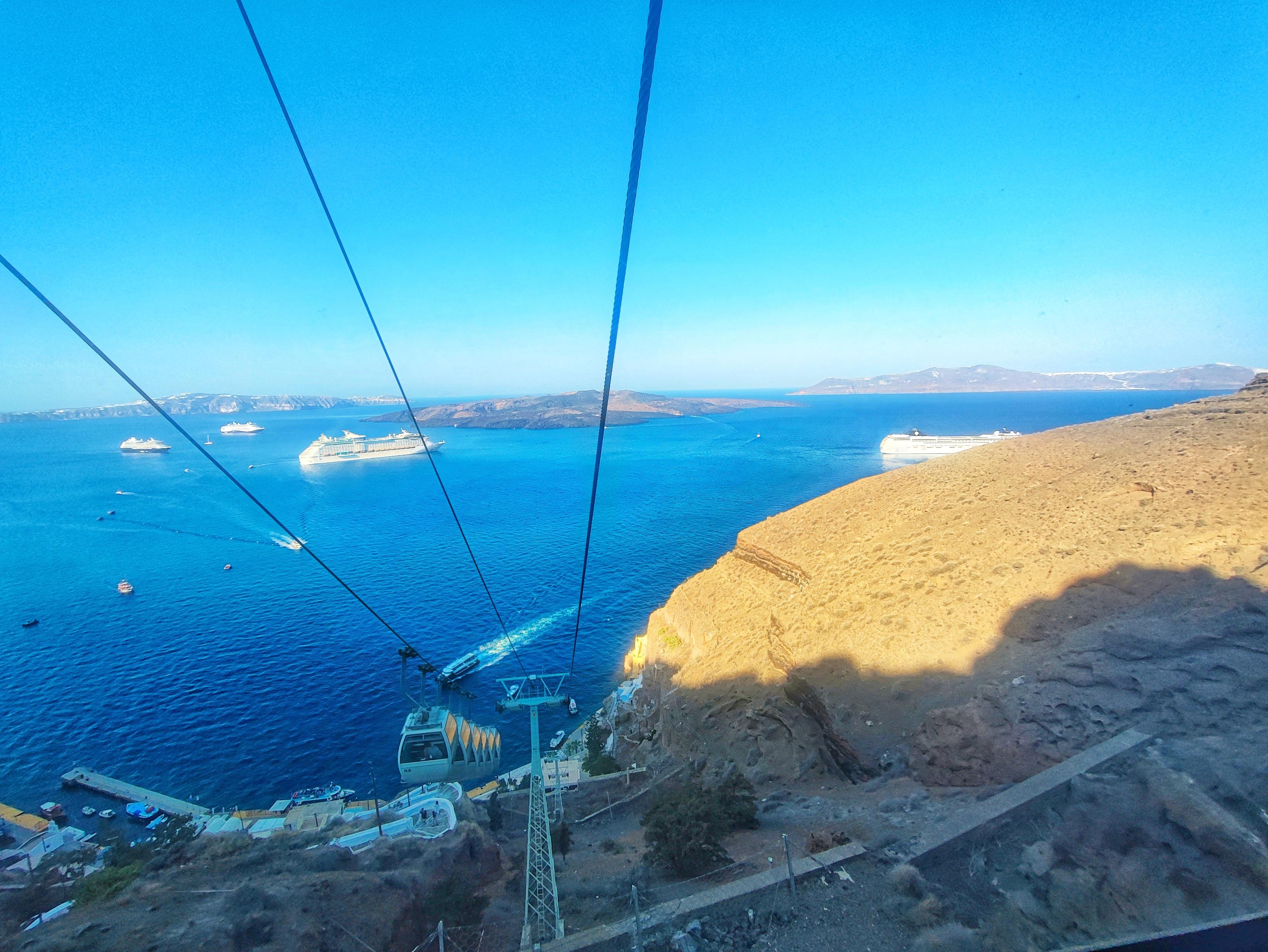 Spesso le compagnie di crociera offrono, però, la possibilità di acquistare un trasporto in scialuppa verso il porto nuovo (dove attraccano i vari traghetti di provenienza dalle altre isole), invece che il porto vecchio, e poi anche un bus (sempre organizzato dalla nave) che permette di raggiungere il centro di Fira dall’interno senza quindi dover prendere la funivia.