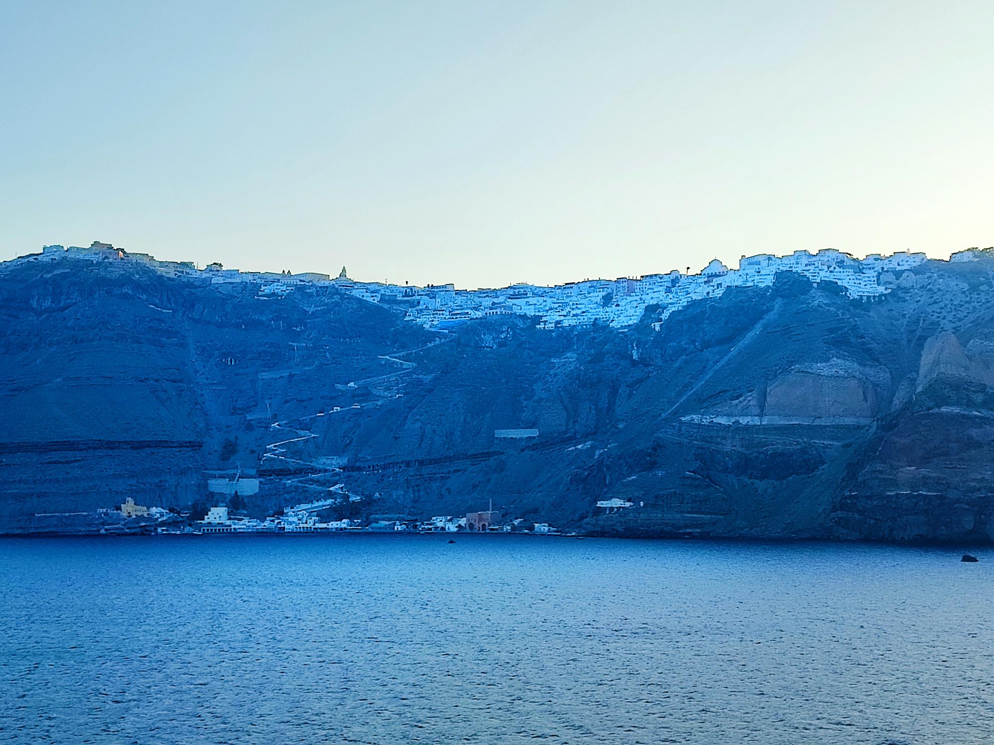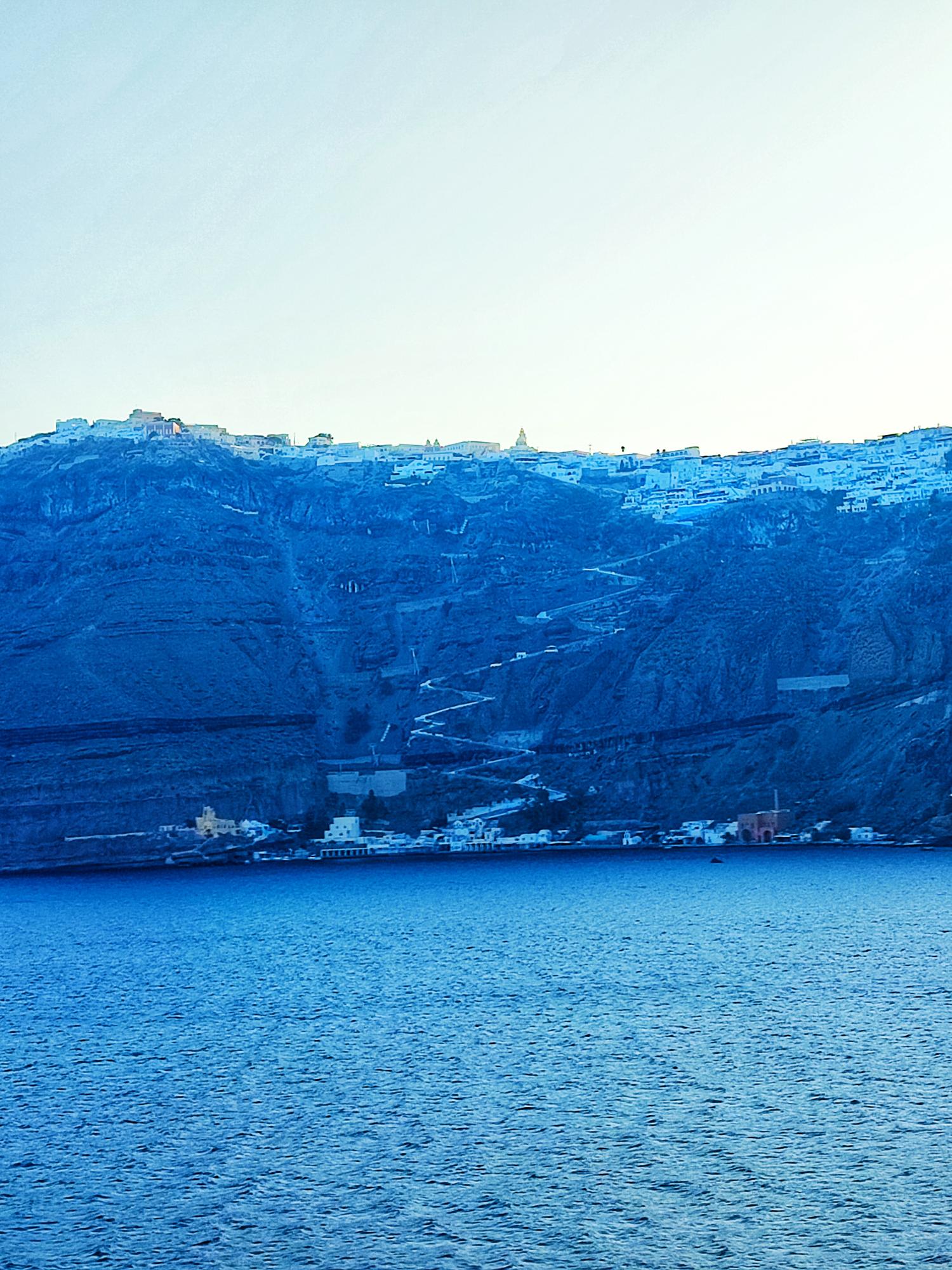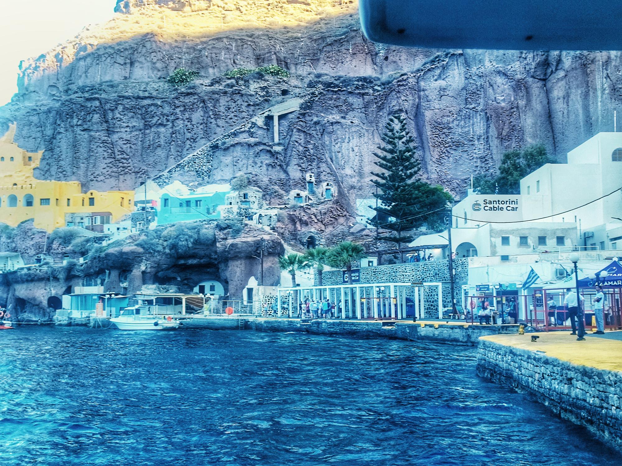 La nave ci ha lasciati al vecchio porto di Fira, ai piedi di una scogliera ripidissima.