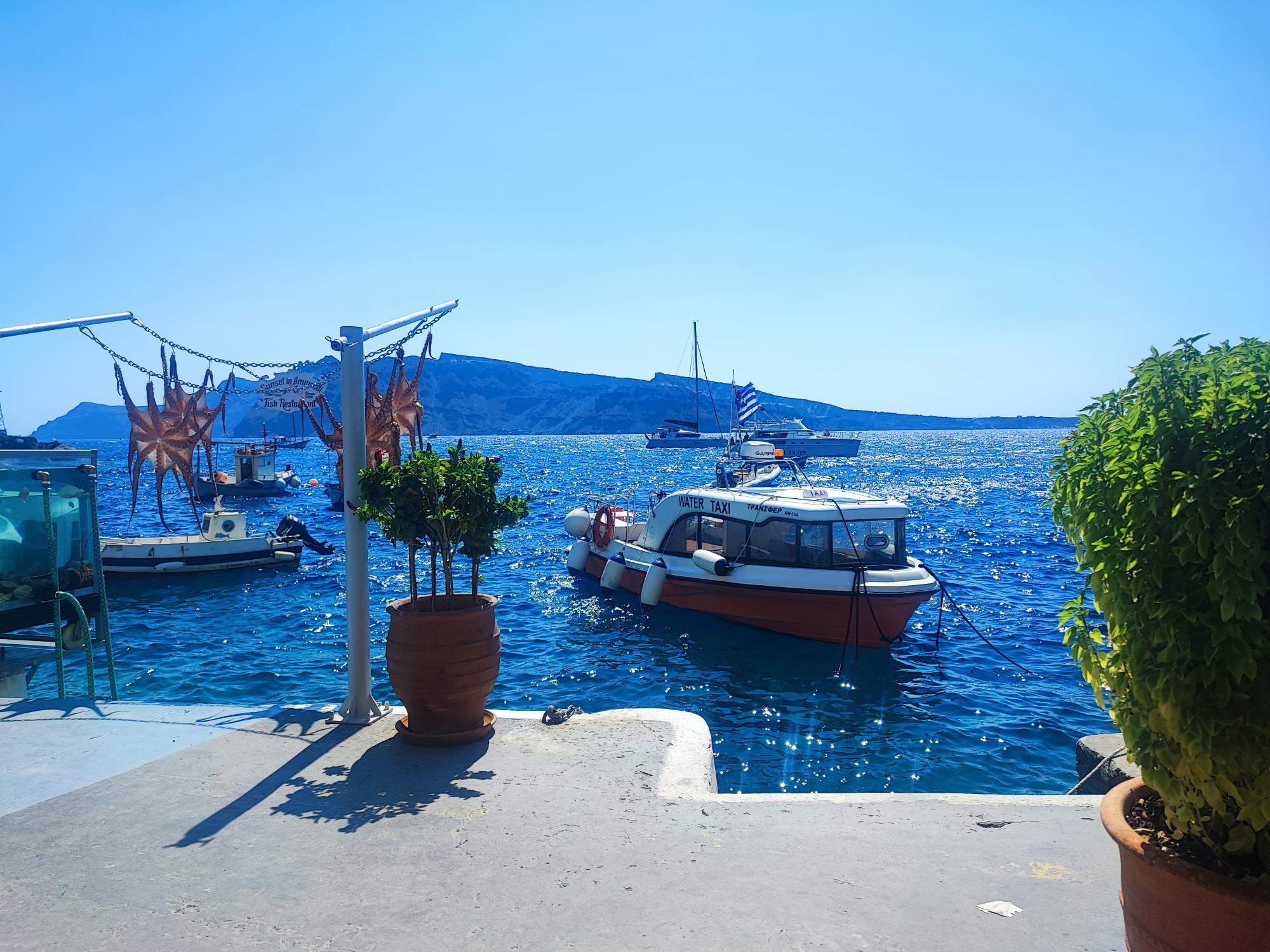 Una volta arrivati al porto, ci siamo imbarcati su un water taxi(che avevo prenotato in precedenza qui contattando tramite whatsapp) che ci ha riportati al porto di Fira.